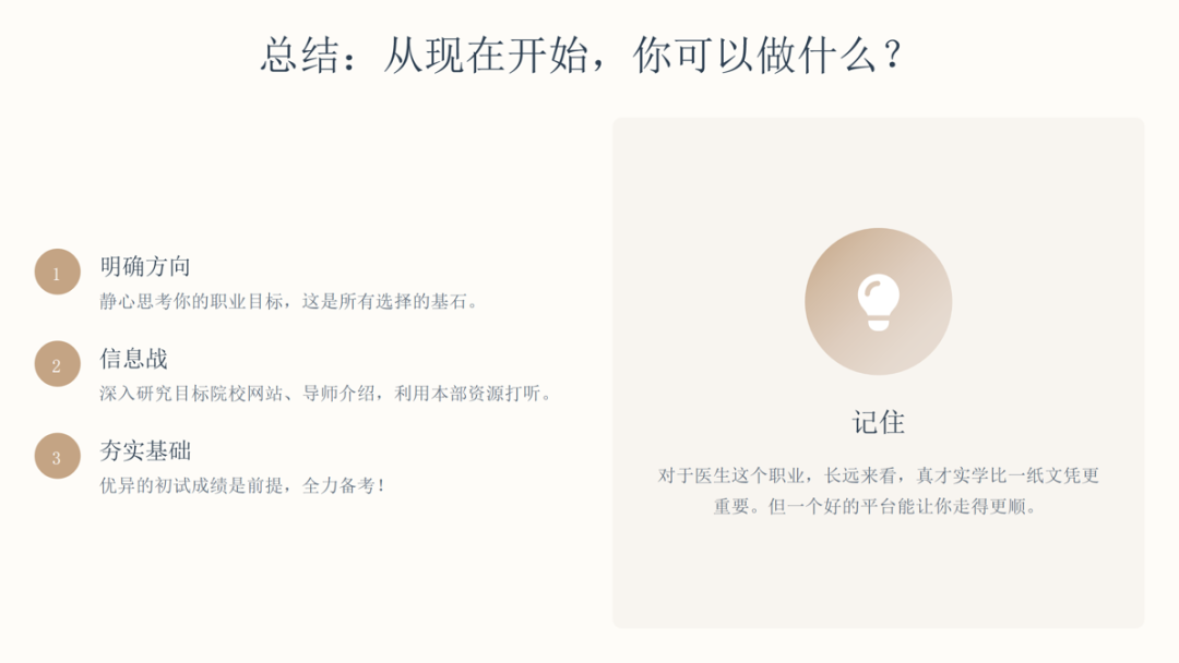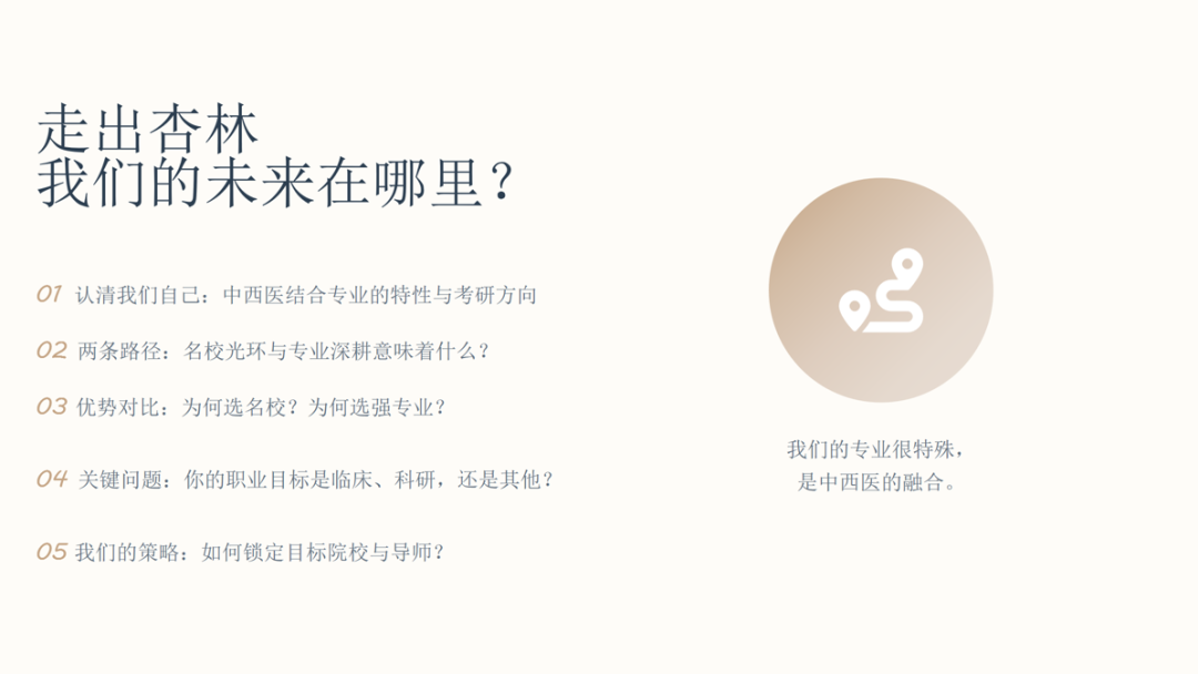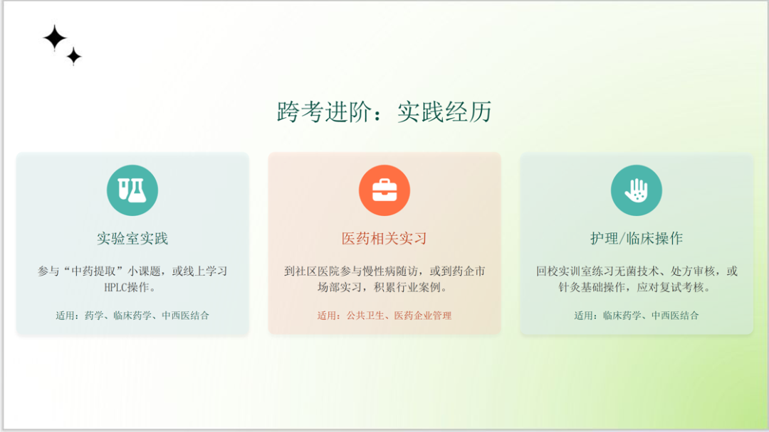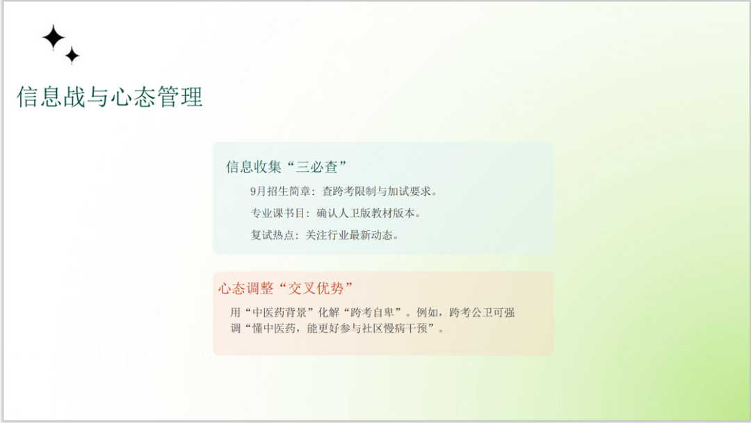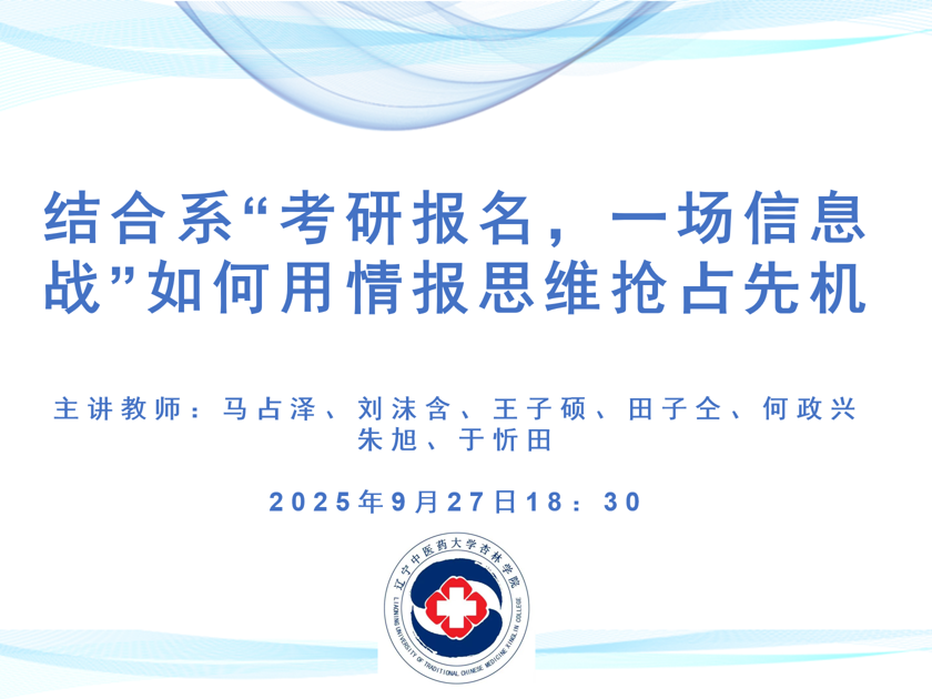 刘沫含老师围绕中西医结合专业考研择校,解析了院校名望与专业实力的权衡逻辑,给出了从自我剖析到目标锁定的六步择校策略;明确了不同职业目标(临床、科研、跨界)对应的择校倾向,还推荐了梯度院校选择;强调择校需综合硬实力、软需求、院校数据等多维度因素,精准定位目标。分享尾声,刘老师衷心祝愿各位杏林学子在考研路上精准抉择、全力奔赴,定能一战成硕,前程似锦!