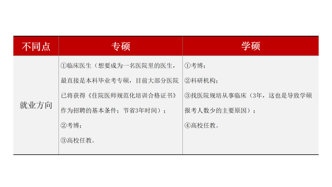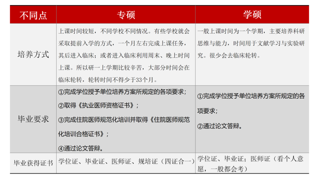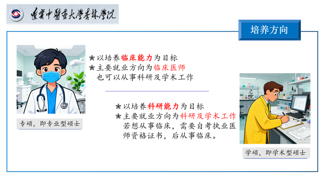 朱旭老师讲解了专硕是以培养临床能力为目标,主要就业方向为临床医师,需完成住院医师规范化培训并取得相关证书;学硕以培养科研能力为目标,主要就业方向为科研及学术工作,二者在考试科目、报考资格、培养方式、毕业要求和就业方向等方面存在明显差异。