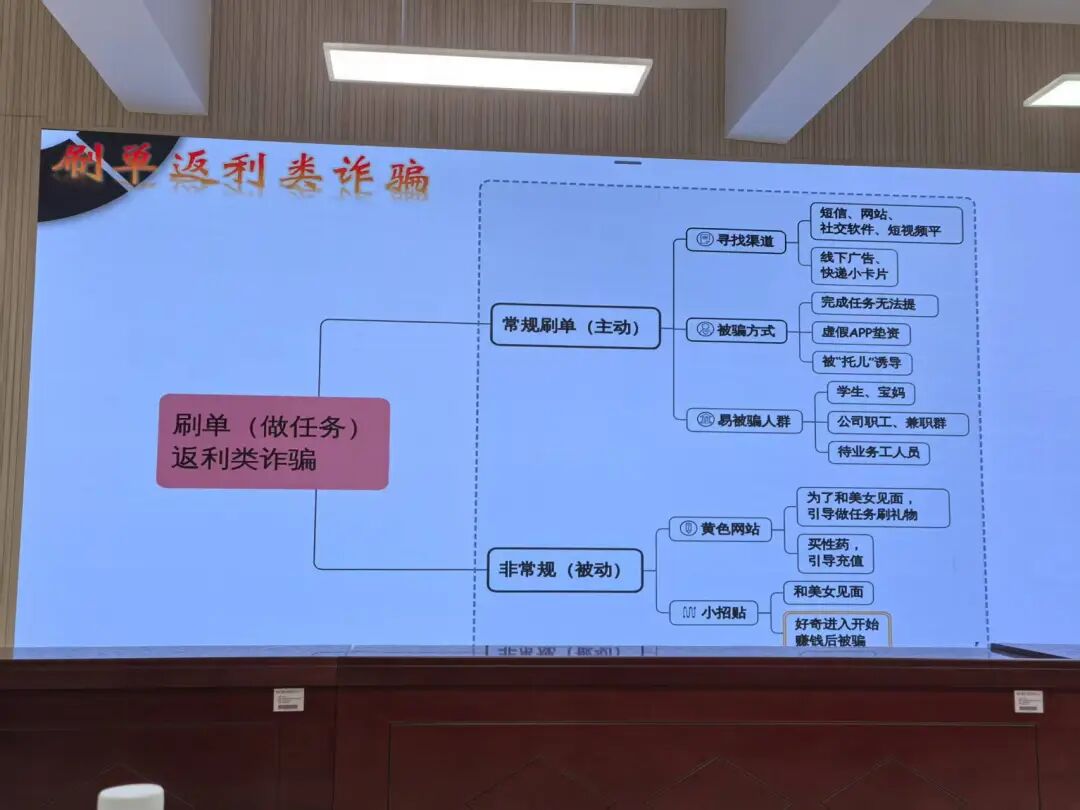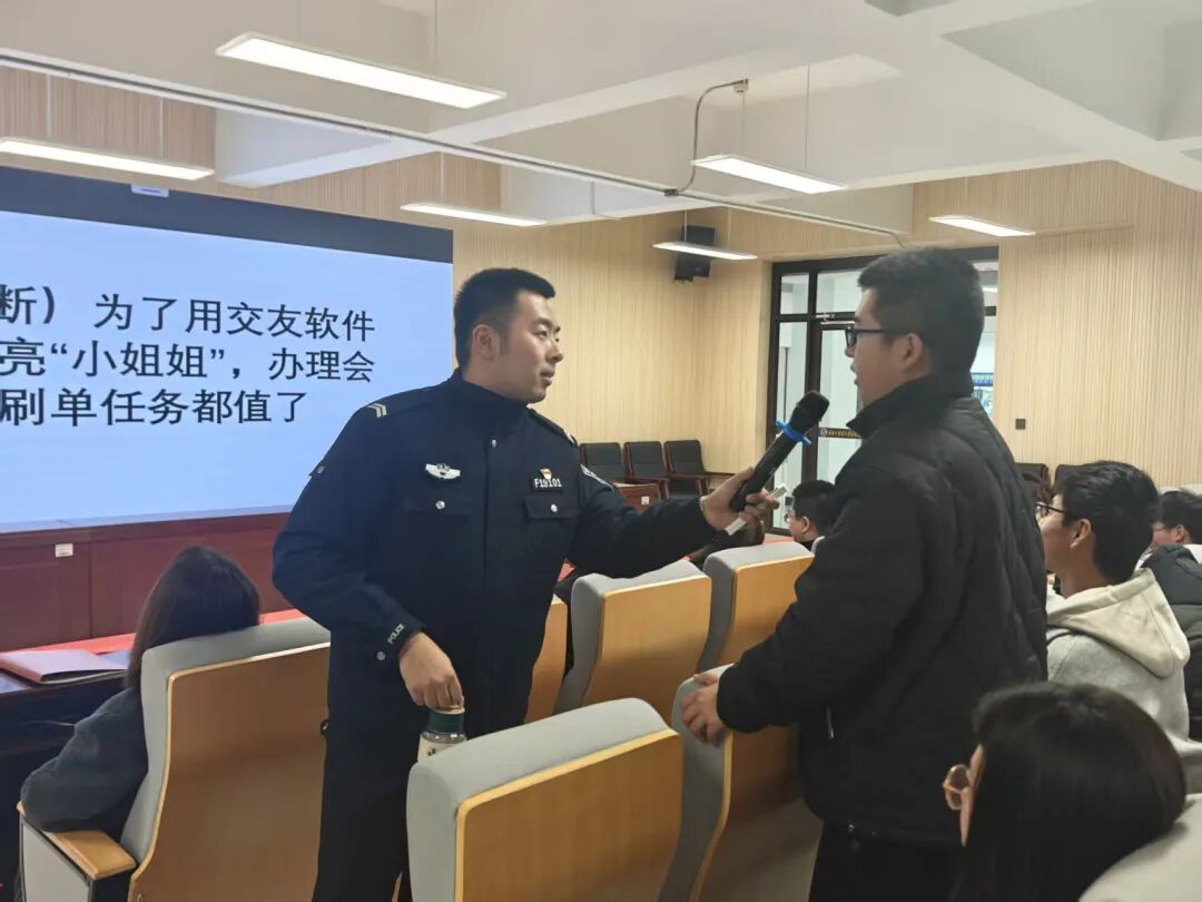 宣讲中,汪致冲警官从三个维度深入剖析电信诈骗。他首先提炼出电信诈骗核心三要素:隐藏身份的诈骗分子、电话网络等通讯手段、骗取资金为目的。随后通过缅北电诈案例视频,揭露诈骗团伙的运作内幕,警示"境外高薪"背后的陷阱。在解析学生群体易遭遇的诈骗类型时,汪警官特别采用互动方式进行讲解,以"有没有同学在网上买卖过游戏装备?"等贴近学生生活的问题开启话题,现场气氛活跃。他还针对刷单诈骗、虚拟购物、游戏交易、物流客服及冒充身份等常见骗局进行了重点解析,学生在积极参与过程中加深了对反诈知识的理解和记忆。