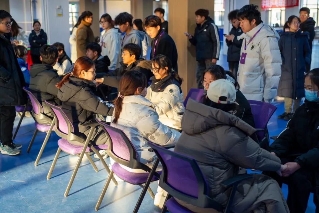 以签到抽取的卡片为依据,同学们迅速找到了卡片匹配的伙伴,成功组建队伍后,紧张又有趣的“手牵手”默契挑战火热开启!大家按分组面对面落座,紧紧握住伙伴的手,凝神倾听主持人的指令。“芹菜!”“兔子!”随着植物、动物名称相继响起,大家迅速做出举手或放手的反应,动作失误的同学遗憾淘汰,获胜的队伍则收获阵阵欢呼。更动人的是,输掉的队伍真诚地向赢家大喊“你们更默契”,让竞技氛围中满溢着包容与善意。