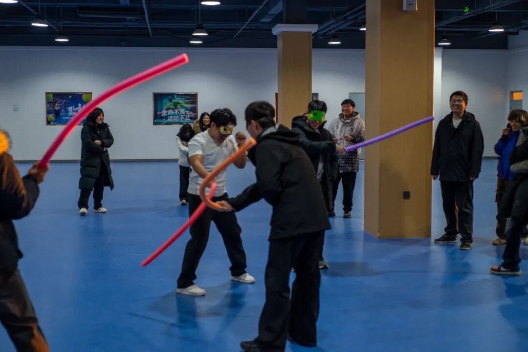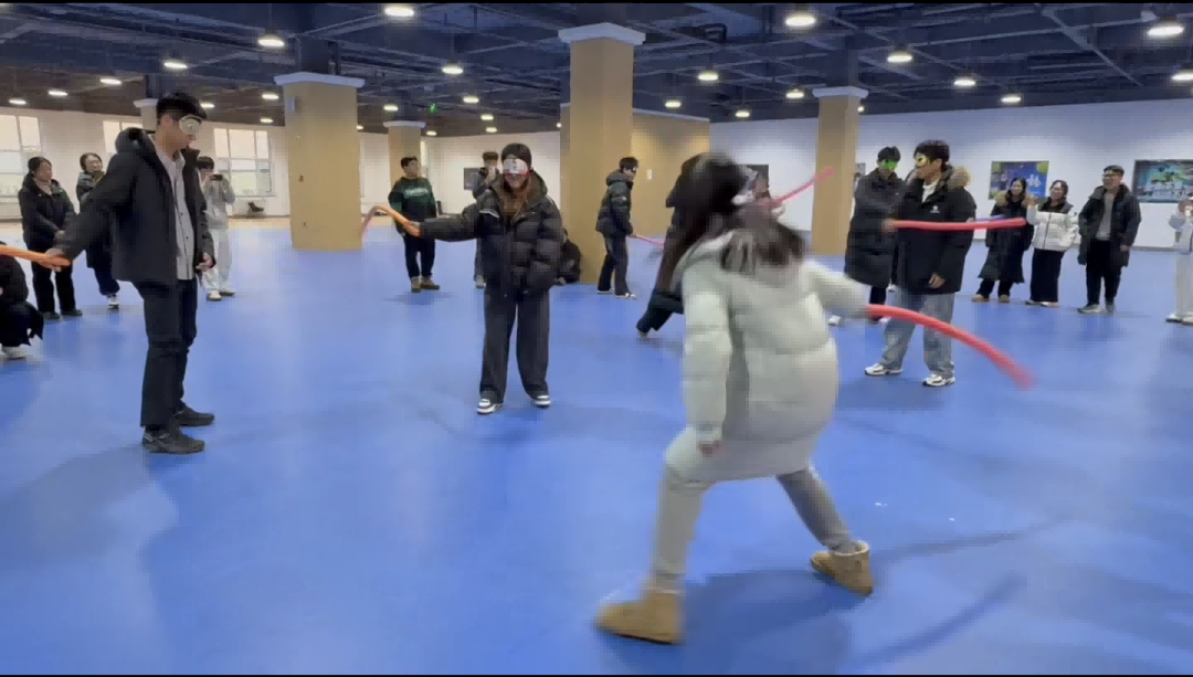 最让人热血沸腾的“蒙眼互打游戏”将活动氛围推向高潮!此前“桃花朵朵开”环节组成的队伍中,老师们也主动加入,化身与同学们并肩作战的“勇士”。蒙着眼罩的师生们在队友的精准指挥下,凭借听觉辨别方向、奋勇“作战”,场上不时传来阵阵欢笑与惊呼,场外的队友们则热情呐喊助威。这场充满欢乐的对抗,不仅让师生情谊在互动中升温,更让团队间的信任感与协作力愈发浓厚。
